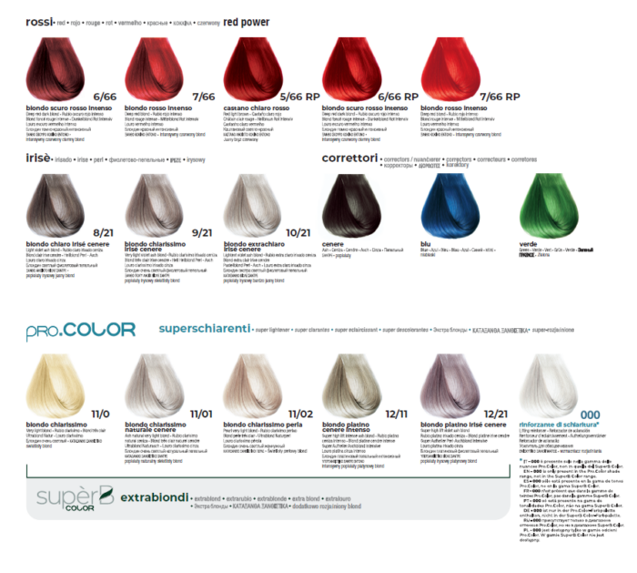 - Para las series naturales y fantasía (MIX 1:1,5), mezclar 100g de color en crema con 150g del peróxido Pro.Oxigen Cream elegido de acuerdo con el tono de aclaración deseado.